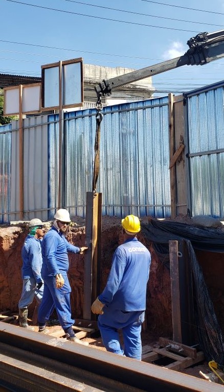 | - Foto em 15/04/2025 - Implantação de perfis metálicos nos tubuões (fustes) da contenção da esquina. | |